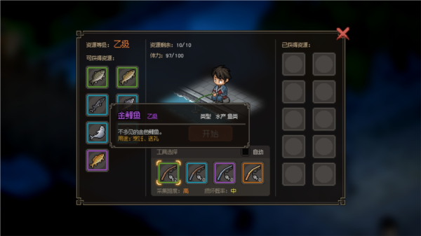 乙级资源点:包含丁级资源【鲫鱼、鲤鱼】;丙级资源【鲟鱼、鲈鱼、草鱼、河蚌】;乙级资源【金鲤鱼】