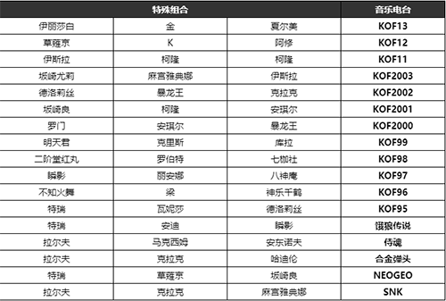 特殊组合是拳皇系列中最有意思的彩蛋,只要使用对应的组合通关,就可以获得对应的奖励,拳皇15的特殊组合在通关后不仅会解锁对应的电台bgm,还会有相关的cg彩蛋,希望看完本篇攻略的玩家都可以在游戏中解锁特殊bgm。更多的内容请持续关注本站网,为你带来****的游戏相关内容。