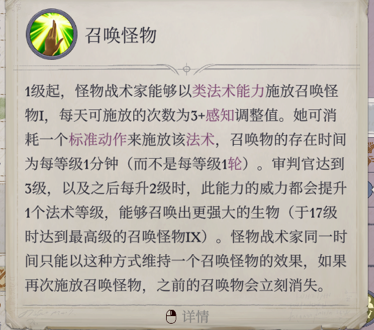 ② 怪物战术家:用审判能力换来1-9环的召唤怪物(作为类法术能力,使用次数为3 感调/天),同时5级可以给所有召唤物分享团队专长(不包括动物伙伴)。这个能力出的召唤生物存在时间是每**1min,主感知加点次数也有很多,约等于全程常驻4个左右的宝宝,前期的体验会很不错,5级分享精准打击,6级出包抄,可以当靶子也可以给前排创造包抄和借机的环境。不过召唤流主要的问题还是召唤生物没什么成长性,**要玩的话可以走灵使的路线。