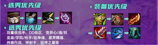 大嘴的装备优先级低于前排坦度装备,中后期能有一件羊刀输出能力就能得到大幅度提升;大嘴的**装备是羊刀、巨杀、水银,但并不是不可更换,大嘴技能是可造成目标百分比的魔法伤害,装备能提升攻速与法强的收益均比较高,如果羊刀可替换为火炮,这版本火炮开局增加60%攻速,大嘴开局就可爆发;如水银也可替换正义/法爆/帽子来进行增伤。