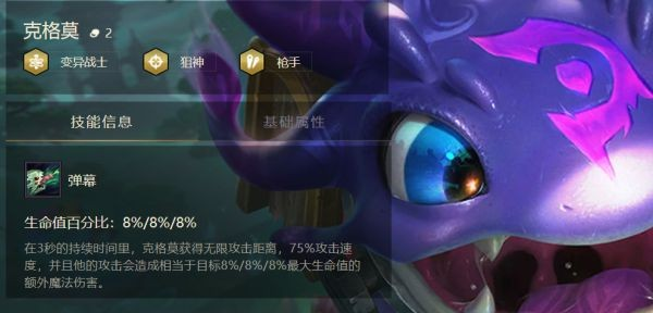 大嘴是变异战士、**、狙神3羁绊棋子,**提供攻击力与2次攻击加成,而狙神则对越远目标造成的伤害越高,变异战士羁绊随机均都大嘴有极高的收益加持,特别出斩杀的时候,这套阵容强度大幅度提升。另一方面大嘴技能造成敌方**生命值的百分比魔法伤害,3星后搭配攻速装备或法强装备输出直接**。