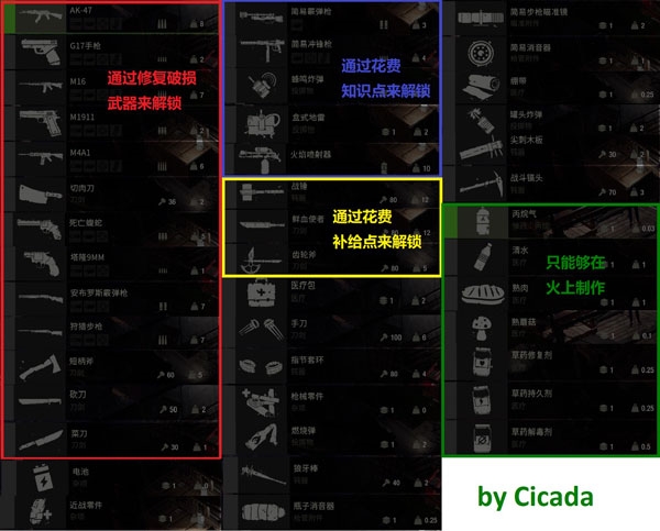 红色框内的是破损武器维修的配方,蓝色框内的是花费知识解锁的配方,黄色框内的是**到达后在物资商店