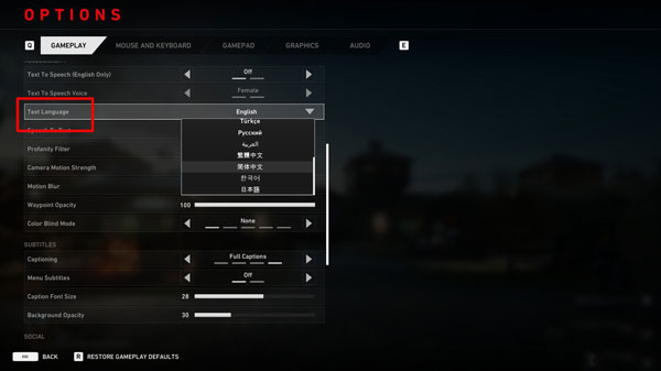 进入设置界面后在GAMEPLAY页面下滑,在Text Language选项除选择简体中文,随后游戏内的文字就会**变更为中文了。