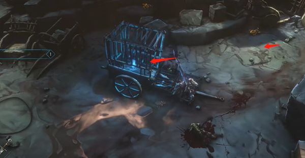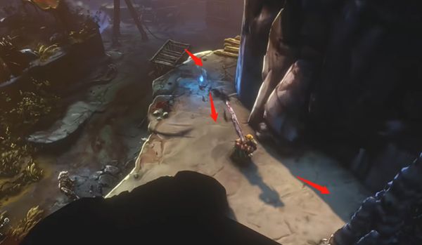 继续往前走,与左侧的笼子里的NPC进行对话。对话结束后走到一个路口处,左转沿着路走到尽头,注意躲避高台上远程敌人的攻击。然后从尽头开始往右走到尽头可以看到一个新路口。