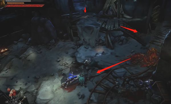沿着宝箱旁边的楼梯上木板,打开木板尽头处的开关,可以开启中路尽头被封住的门。然后回到升降梯的位置往上走,可以看到一个复活点。