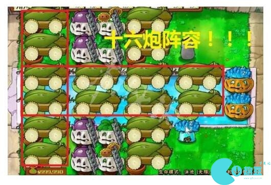 评价:利用十六门玉米炮进行不间断的攻击,使用冰蘑菇进行减速能够提供输出空间。