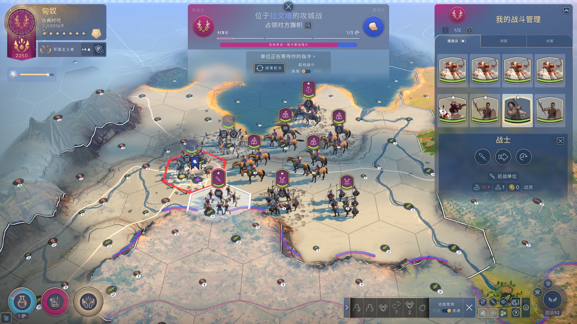 手动部署军队依然可以进行在此视角下的自定义战斗,战斗总共的轮次会出现在上方提示,回合结束内拿下旗帜就可以获得胜利,具体战斗的思路还是老一套,远程消耗近战收工,城市攻坚战中如果没有单独驻守部队仅靠自动的民兵防守的话进攻会非常轻松。
