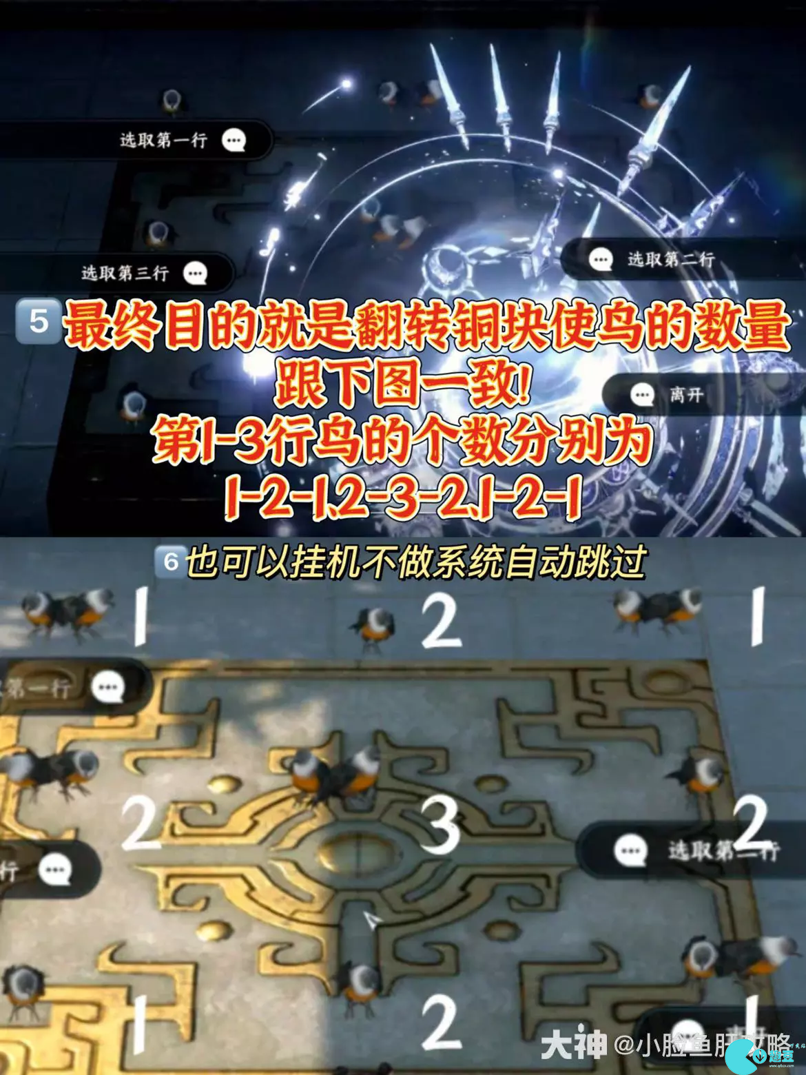 5、**目的就是翻转铜块使鸟的数量跟下图一致!**-3行鸟的个数分别为:1-2-1、2-3-2、1-2-1。