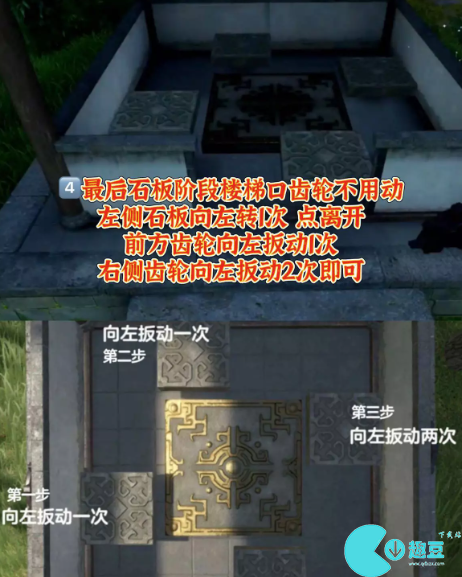 4、**石板阶段楼梯口齿轮不用动 左侧石板向左转1次 点离开 前方齿轮向左扳动1次 右侧齿轮向左扳动2次即可。