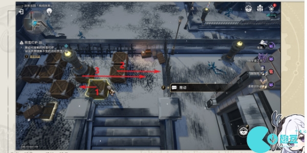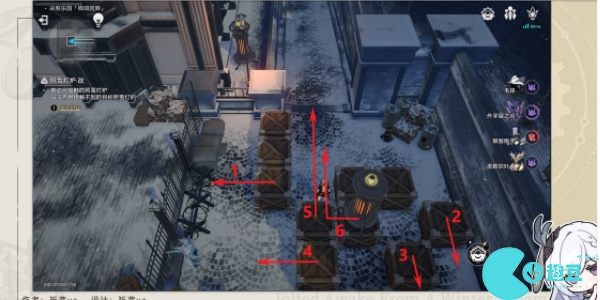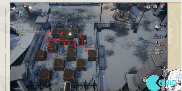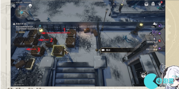 4、来到西边位置的灯炉按照下图顺序移动木箱进行解密。
