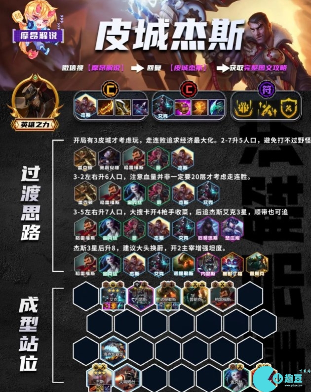 当前还是建议前期金克丝(机械手臂)或杰斯(金鳞发明家)比较胡的时候考虑这套阵容,虽说厄斐琉斯连续两次版本增强,但环境稳定,后期的上限不算太高,比较吃普朗克,还是比较建议金克丝与杰斯来C。