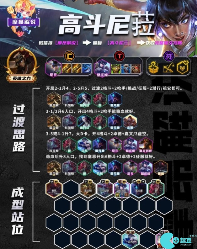 高斗尼菈这周热度小幅度增加,是仅次于裁决铁男的第二个毒瘤阵容,这套阵容6格斗充当前排坦度教高,过渡比较容易,还有瑟庄妮被动的真伤,尼菈的输出强度非常高,而且这套阵容体系哪怕尼菈不胡,后期转强势5费来C强度也非常不错。