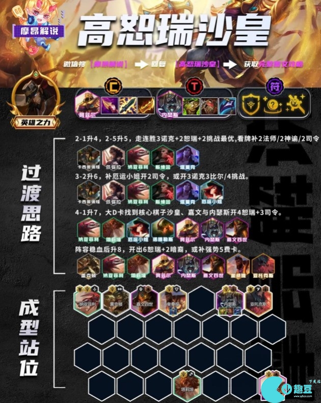 高恕瑞沙皇这周热度**,是除了3大毒瘤阵容外吃分与吃鸡最稳的阵容,这套阵容阿兹尔也是多次增强,输出强度较高,阵容过渡比较顺滑,但缺点就是比较吃装备与转职,大后期比较吃2星5费,特别是奎桑提,如果不来容易后4出局。