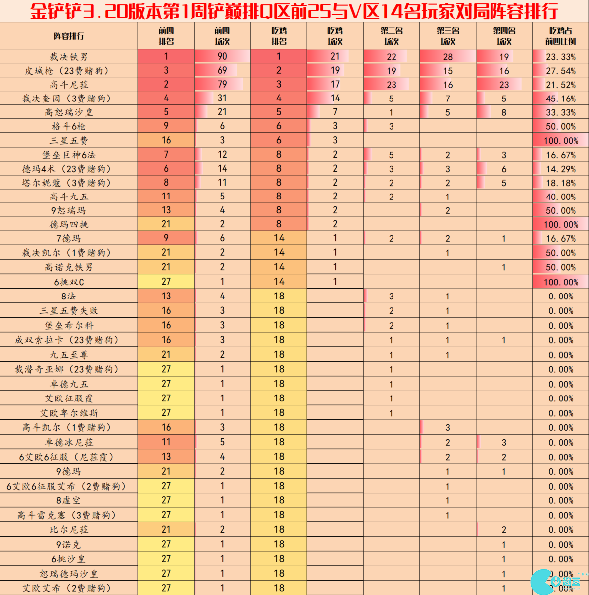 这周吃分场次79场,吃分排名第二名,吃鸡场次17场,吃鸡排名都是第3名。阵容吃鸡占前四占比例21.52%。