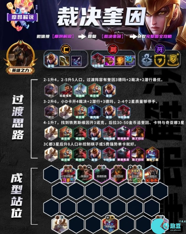 裁决奎因这周热度变化不大,但只要奎因能3星,不论是选择卡特副C还是铁男副C,前二率都极高,在胡一点基本就能吃鸡,可以说是当前吃鸡率**的阵容。