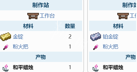 制作和平蜡烛需要一个粉火把和两个金锭或铂金锭,这意味着玩家至少要干掉一个粉色史莱姆