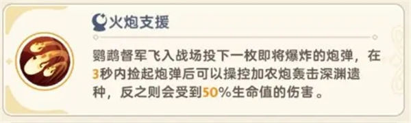 进入boss场景后每隔45秒,鹦鹉督军会在boss前丢下一枚**,必须在3秒内捡起,否则会对全队造成巨量伤害。捡起后需要在20秒内点击场景右下角炮管进行发射。**会对boss造成12%血量的巨额伤害,在boss虚弱期可以翻倍造成24%的伤害。