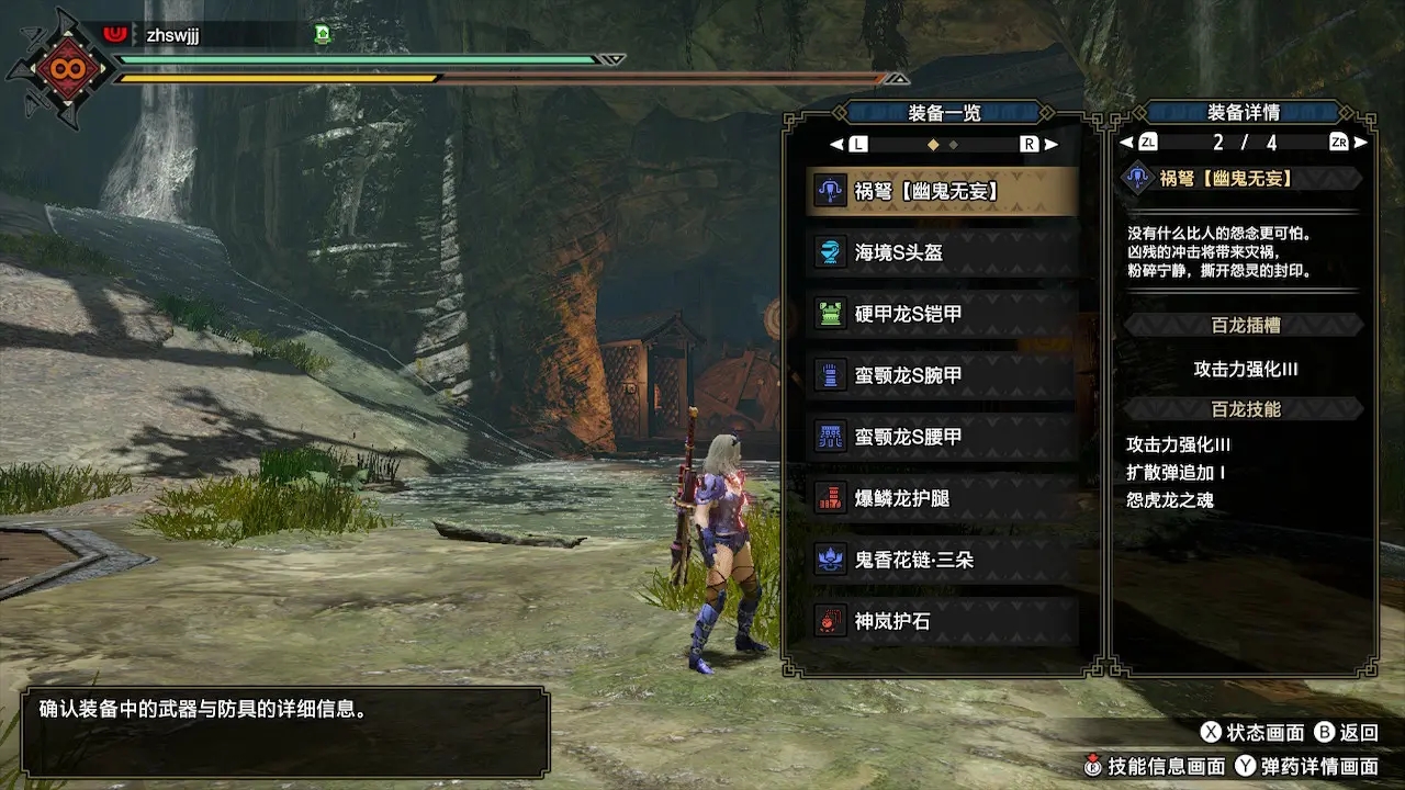 武器:祸弩【幽鬼无妄】(怨虎龙弩,老劳模了,零件消音器,百龙攻击力强化III)