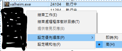 3. 启动 Valheim -> 选择 Vulkan启动 -> 工作管理员 (Ctrl Shift ESC ) -> 详细资料 -> valheim.exe ->设定优先顺序 -> 高