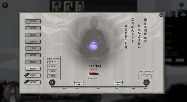 炼气满级在突破「筑基境」选择「天道筑基」,会需要3项「天材地宝」及6项「必要材料」。