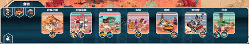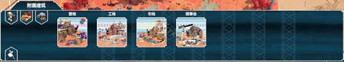游戏中可建造的建筑共有三类:材料类、食材类和附属建筑。其中前两种分为**式和移动式两种,附属建筑均为移动式,移动式建筑在一局游戏中反复移动,并能带入下一立足点再次建造,但造价更高,**式无法被带入下一场景中造价相对来说要比移动式略低。每种建筑都可以进行两次优化获得增益,其中商队优化效果较多对整体增益较大。