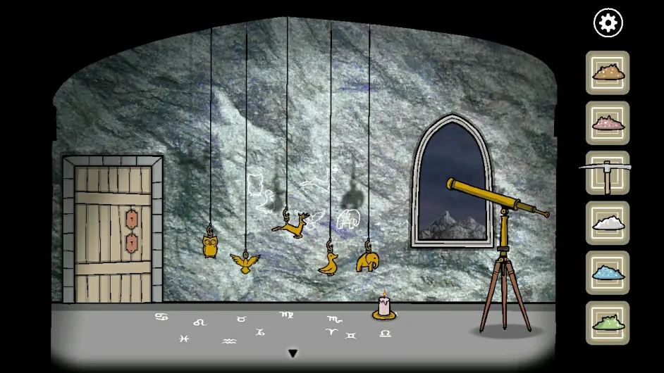 7、到达二楼,移动蜡烛将动物的投影与壁画重合,得到提示:猫头鹰=巨蟹,鸭子=射手,鸽子=双鱼,麋鹿=摩羯,大象=天秤。