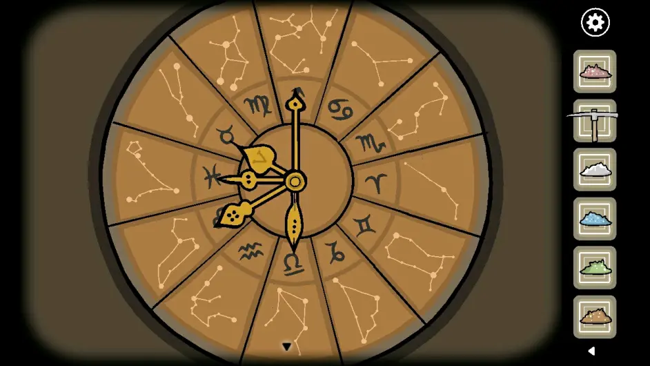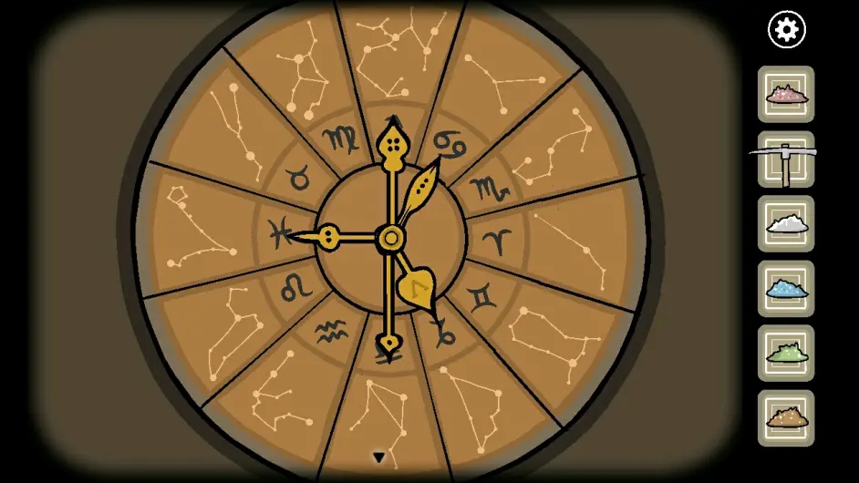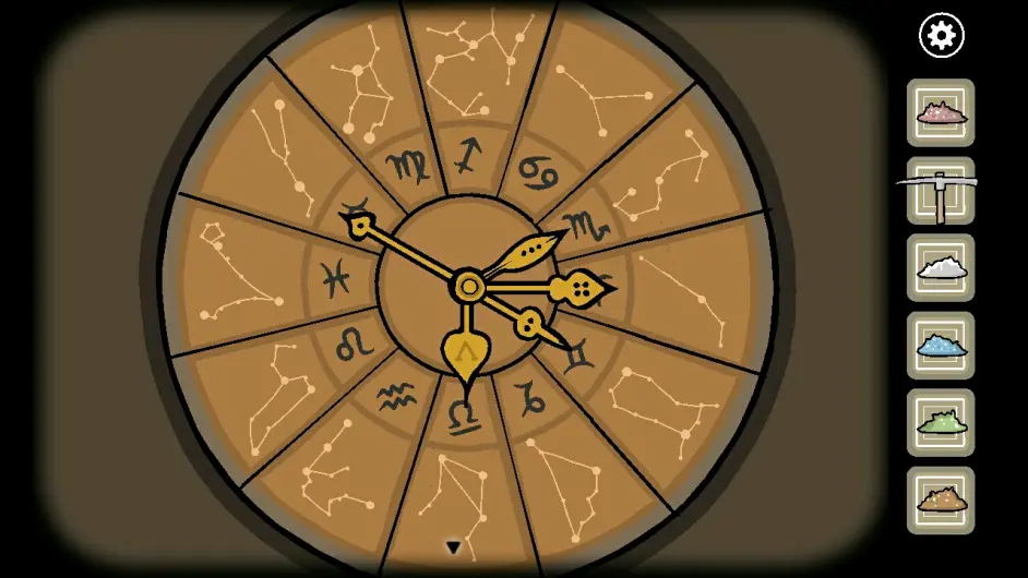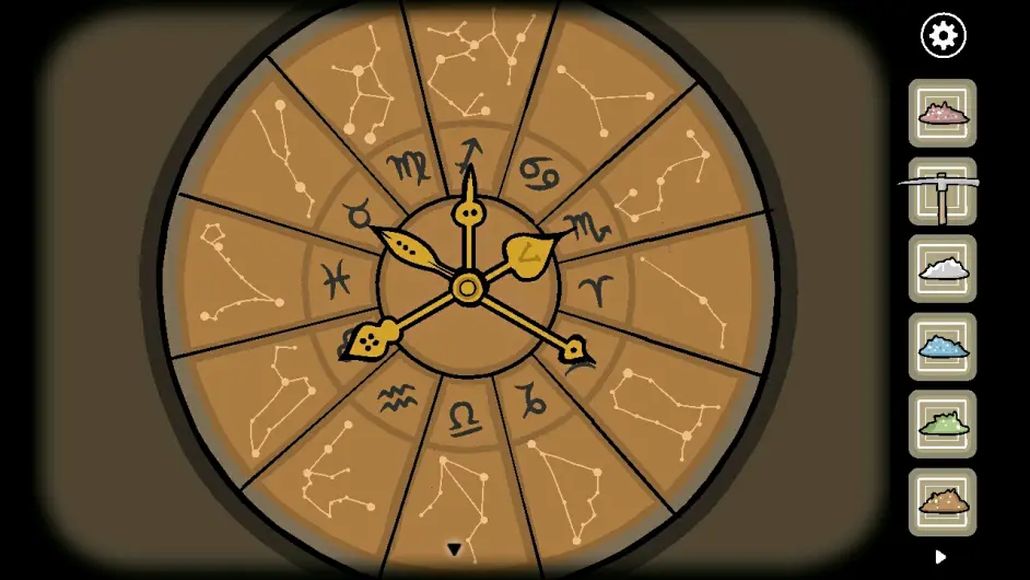 5、观察出现的黑影获得提示:金牛、双子、天蝎、白羊、天秤。再观察五个人模仿的姿势获得提示:射手、双鱼、天秤、狮子、金牛,根据提示来到暗室,找到十二星座的位置。