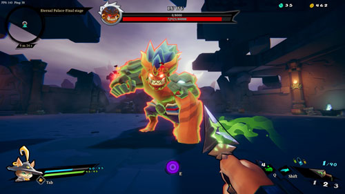 蓄力射击:向玩家射击激光(拳头周围发光指示)。这种攻击很难**躲避,不过幸运的是单发激光伤害并不高,而且攻击的启动时间比较长,玩家可以跑到场景的柱子后来抵挡攻击,柱子在承受多次伤害后会坏掉,所以合理的利用柱子。