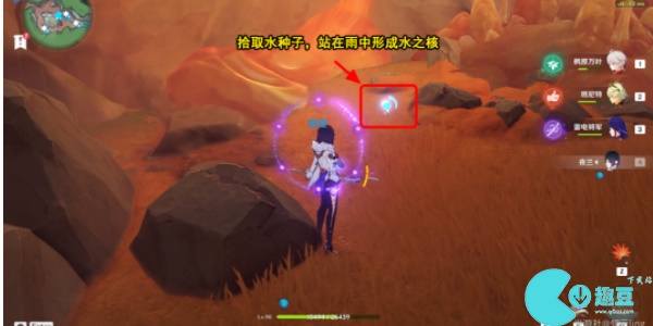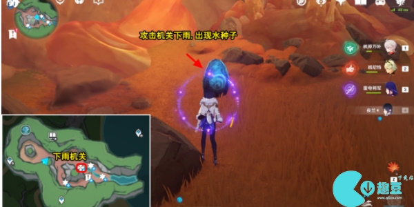 3、然后来到下雨的机关旁,攻击下雨机关出现水种子,拾取水种子站在雨中形成水之核。
