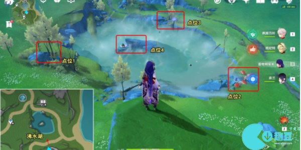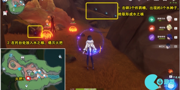 2、玩家收集水球停下后,向西游上岸,来到下图位置,把小怪打掉不然碍事;然后来到火把1的位置,**步:击碎三个**桶,拾取出现的3个水种子,形成水之核。第二步:将水之核放在火把旁托台处,熄灭火把1。