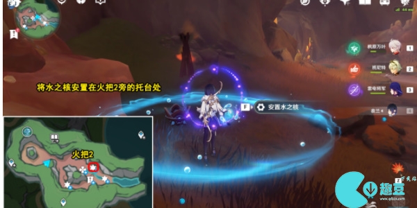 3、接着前往火把2处,将水之核安置在火把2旁托台处,熄灭火把2。
