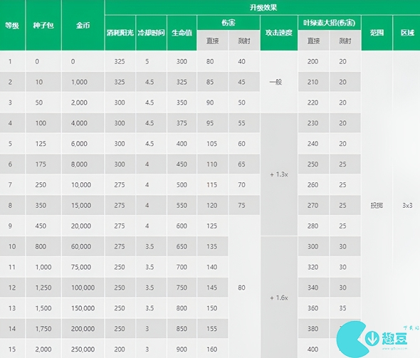 | 四阶 | 能力觉醒:种植时有80%的概率释放大招 战斗能力:增加50%的攻击力和生命值(初始值的300%)。 |