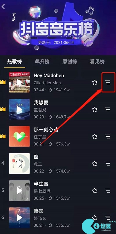 3、进入音乐榜后,找到想听的歌曲点击右侧“三”横线标志。