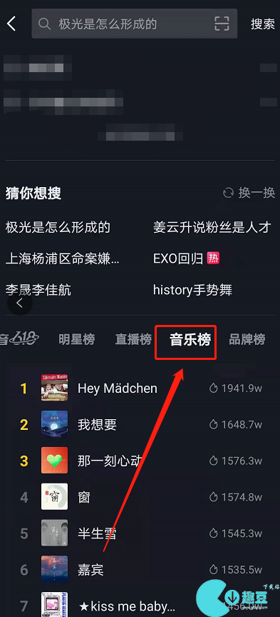 2、点击搜索框后会出现如下页面,点击“音乐榜”进入。