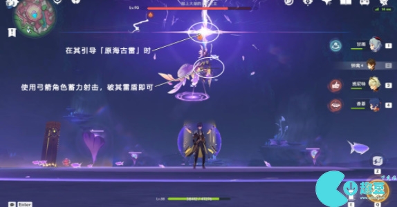 3、等到千年珍珠骏麟引导「原海古雷」时,使用弓箭角色蓄力射击,破其雷盾即可获得成就「砂砾收藏家」。