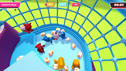 玩家们需要在2分钟的时间之内,从中间的蛋池中抢夺蛋(按E键),运回自己阵营之中,注意,在回去的时候要注意旋转的锤子机关,被打中的话手里的蛋也会被打飞的。