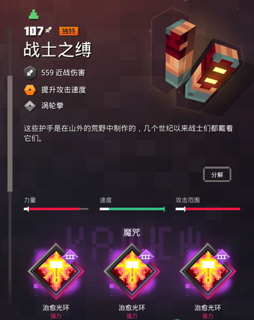 附魔(**X3) **最肉的武器没有之一 因为攻速快 所以几乎**触发光环 3个叠加一起奶一口3000以上 加上叛徒甲25%的攻速和20%近战伤害 再配合胆怯附魔 一拳也有900的输出 虽然总体输出弱于月之** 但站撸一堆附魔怪轻轻松松