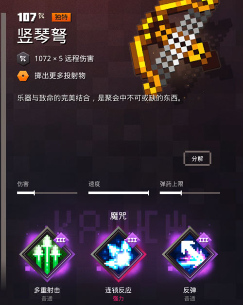 附魔(反弹&多重&连锁) **远程没有之一 配合烟花简直是毁天灭地的**存在 因为多重设计和连锁都是每一支箭都会触发 这把弩自带5次设计 你想想20多支连锁 反射的烟花是什么概念 一发炸掉一图怪轻轻松松
