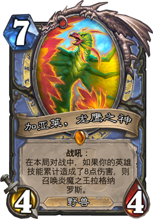 法师随从卡加亚莱龙鹰之神,7费44身材,身材可以说是一塌糊涂,好在效果给力。效果战吼:在本局对战中,如果你的英雄技能累计造成了8点伤害,则召唤炎魔**拉格纳罗斯。