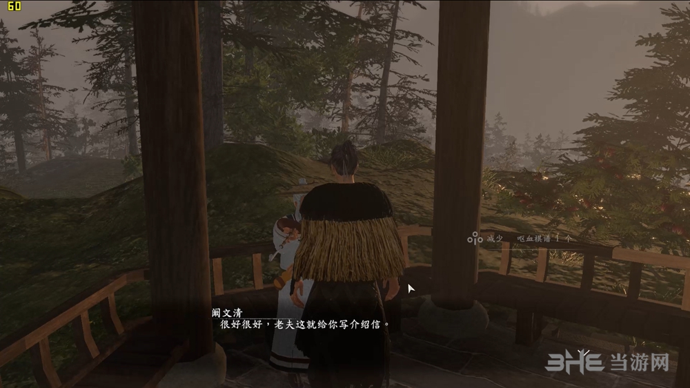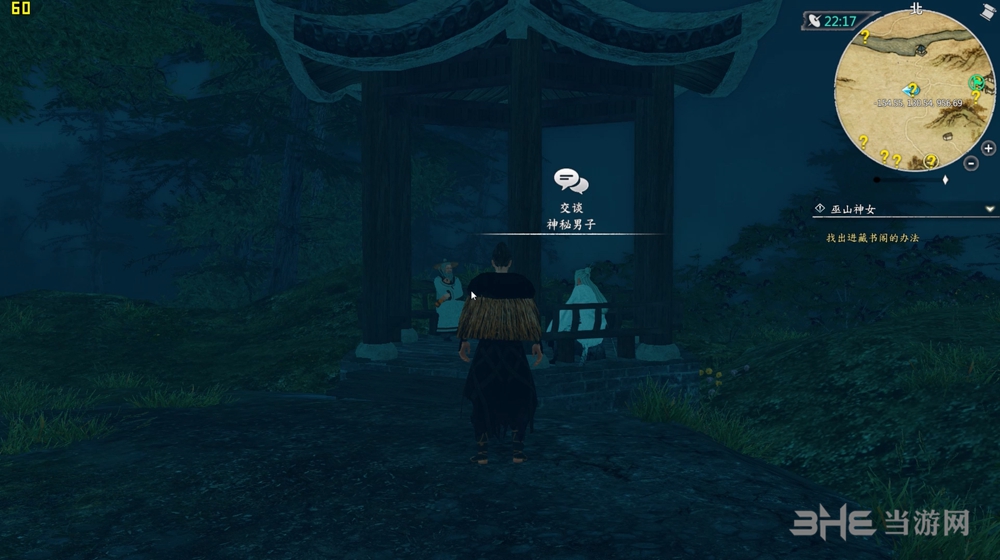 来到地图坐标点(-154.55,130.54,956.69)附近,也就是赋闲书院地图左边的小亭子上,找到阚文青与一名神秘男子。