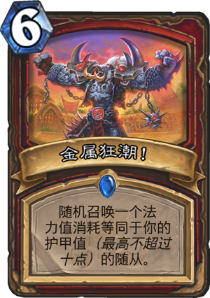 金属狂潮,战士6费法术卡,随机召唤一个法力值消耗等同于你的护甲值(**不超过十点)的随从。