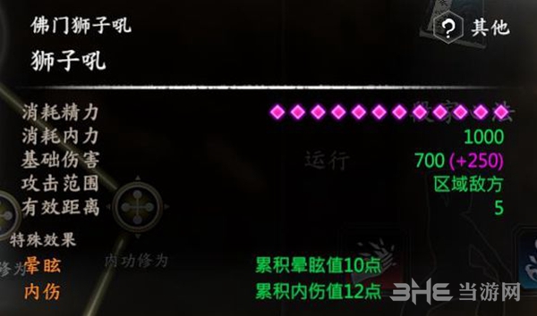 狮吼功练满基础伤害950 距离5的攻击范围AOE 消耗精力12点(这是**)