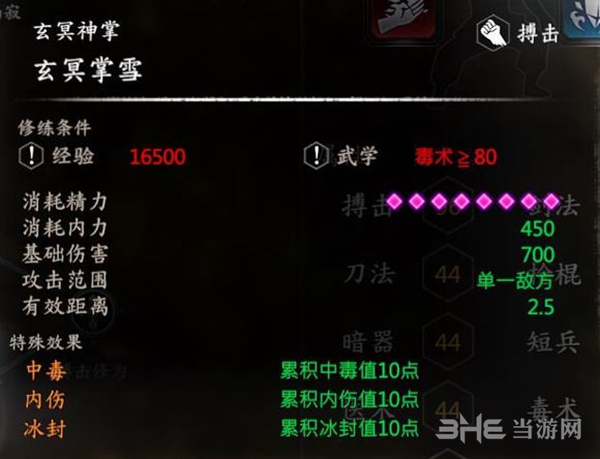特殊效果看起来很不错,攻击距离在拳掌类武学里也算高的,值得一练,但是最坑爹的来了,需要80 的毒术,百损的基础毒术为58,,这就是如果要学会**一招中间至少要学两本毒功,而这招又没有毒术的伤害加成,所以非常的亏,**楼主选择放弃自带武功,开宗立派 正题来了(好吧我承认这些都是废话)