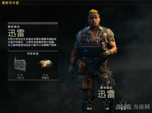 迅雷是一个偏辅助的专家,可以给队友提供弹药和生命值上限,让队友们击杀和获取分数更加有效率。小技能是突击包,迅雷可以在地上放置一个突击包,队友和自己对着突击包按F就可以拿到弹药上限的补给。大技能叫TAK-5,迅雷掏出TAK-5可以****满地图上包括自己所有队员的HP,并且还能提供50的HP上限,也就是说所有人可以有200的HP。