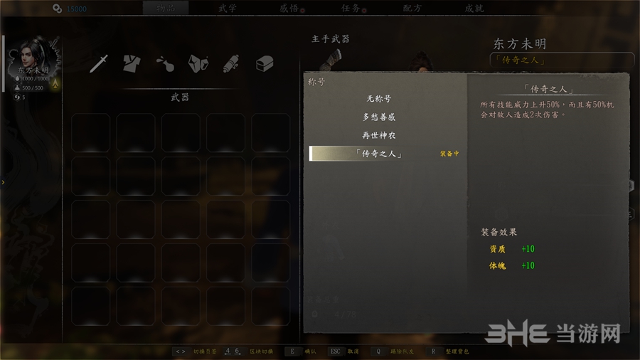 称号:传奇之人(所有技能威力上升50%,且有50%机会对敌人造成2次伤害。资质 10 体魄 10)
