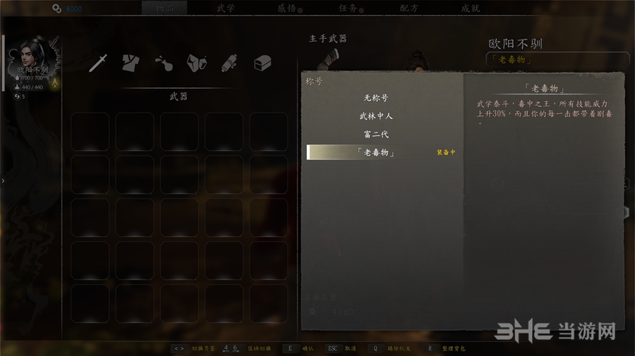 称号:老毒物(武学泰斗,毒中**,所有技能威力上升30%,而且你的每一击都带着剧毒。)