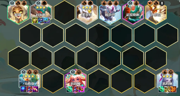 1、阵容组成:克格莫、科加斯、凯特琳、墨菲特、妮蔻、俄洛伊、诺提勒斯、莉莉娅