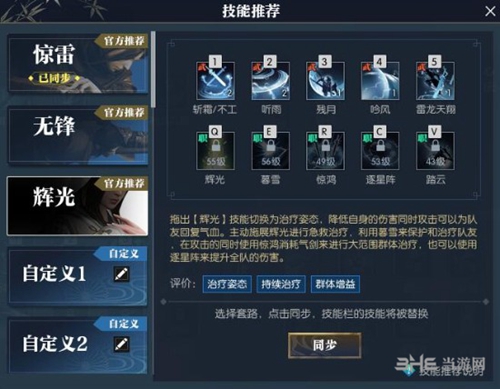 拖出【辉光】技能切换为**姿态,**自身的伤害同时攻击可以为队友回复气血。主动施展辉光进行急救**,利用暮雪来保护和**队友,在攻击的同时使用惊鸿消耗气剑来进行大范围群体**,也可以使用逐星阵来提升全队的伤害。