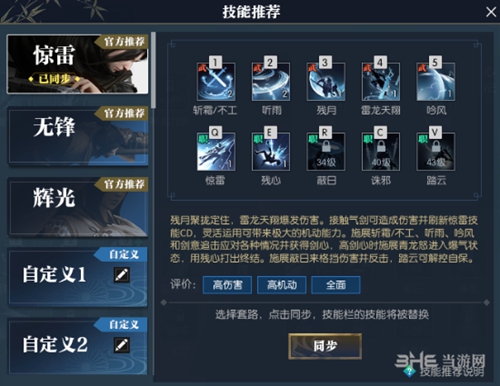 残月聚拢定住,雷龙天翔爆发伤害。接触气剑可造成伤害并刷新惊雷技能CD,灵活运用可带来极大的机动能力。施展斩霜/不工、听雨、吟风和剑意追击应对各种情况并获得剑心,高剑心时施展青龙怒进入爆气状态,用残心打出终结。施展蔽日来格挡伤害并反击,踏云可解控自保。