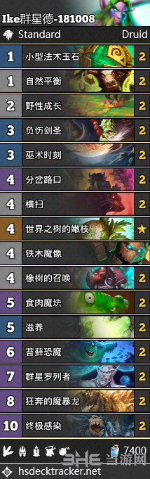 Ike群星德,是上期的改进版,多带了一只恐魔和铁木魔像,去掉了奥术统御者。上期有人问这套怎么赢,虽然谈不上T1卡组,但是强度是**够的,特别是内战(因为德鲁伊不会带沉默)